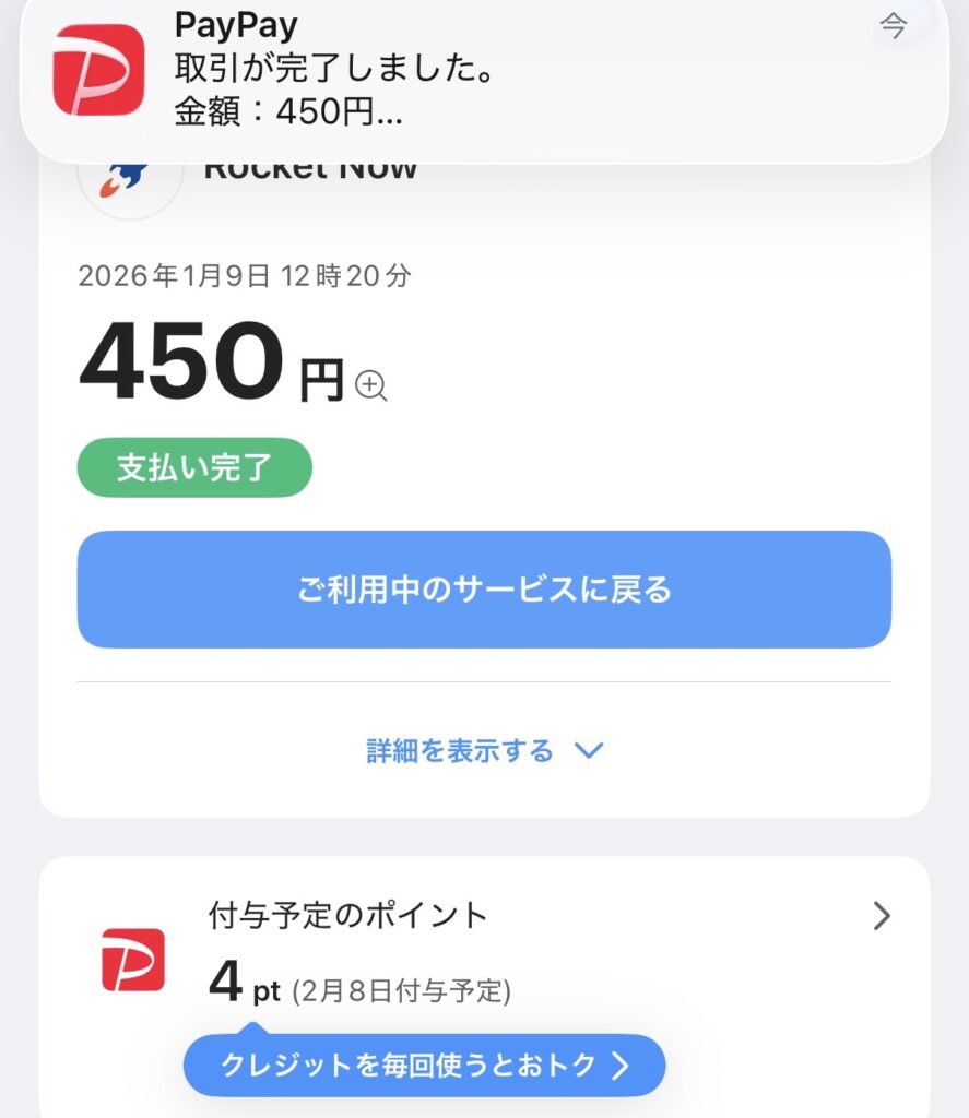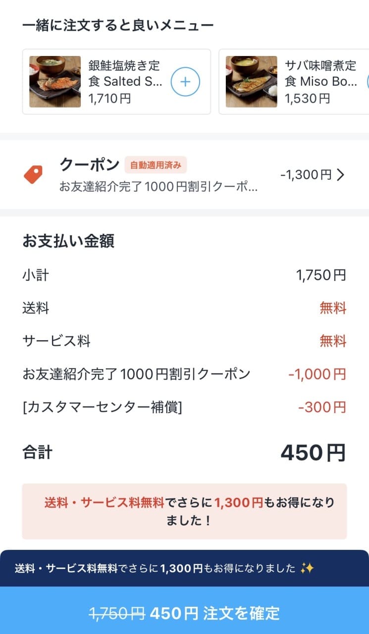 友達招待1000円クーポンを使用し、ロケットナウからもらった補償300円クーポンも同時に使用して、なんと注文金額は450円!!!という。