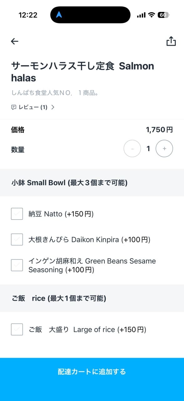 しんぱち食堂 東梅田店で人気No. 1のサーモンハラス定食を注文した時の画面をお見せします。