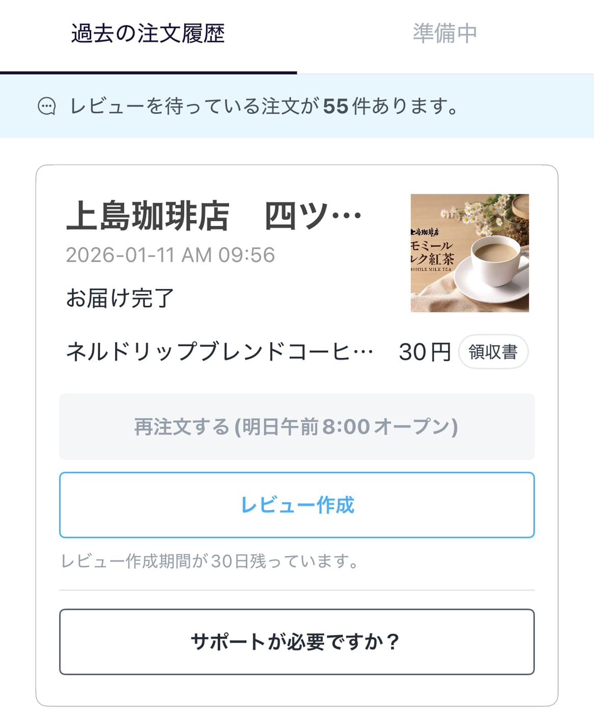 上島珈琲の最低注文金額は 900円なので、870円のホットコーヒーLサイズだと残り30円足りないので、不足分としてPayPayで毎回30円だけ追加で支払っている感じですね。