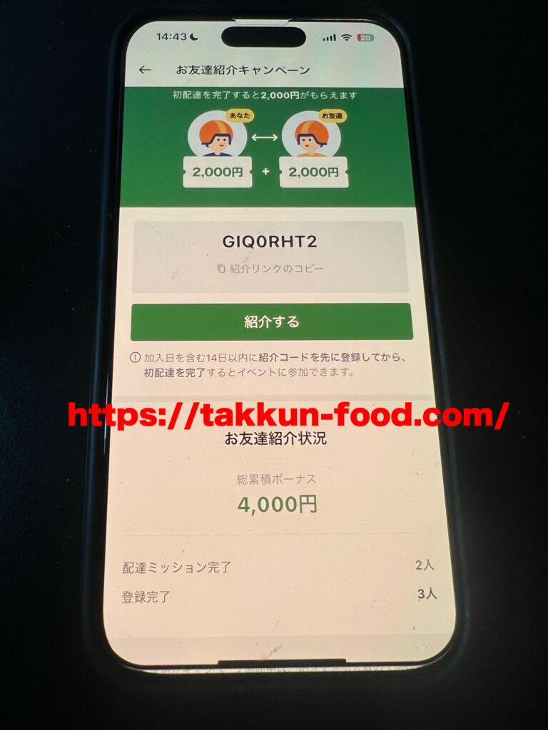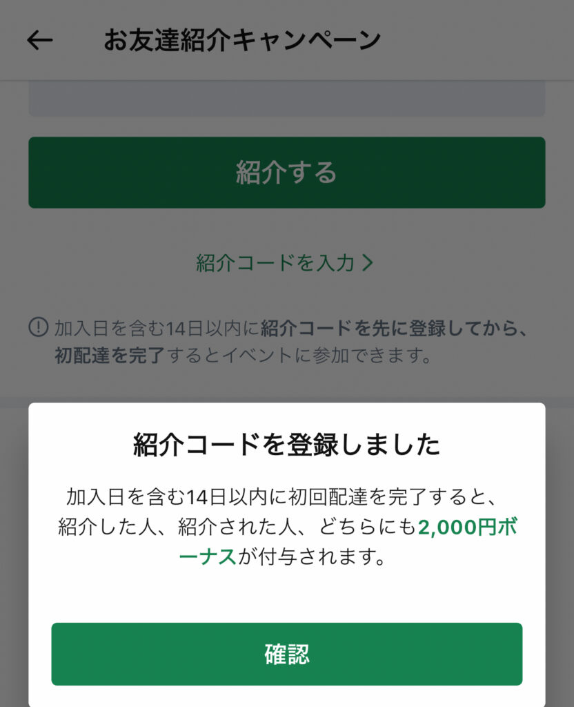 また現在は配達員募集も積極的なため、1人紹介コードを入力してもらい初回配達してもらうだけで紹介者にも紹介された人にもそれぞれ2000円がもらえます。
