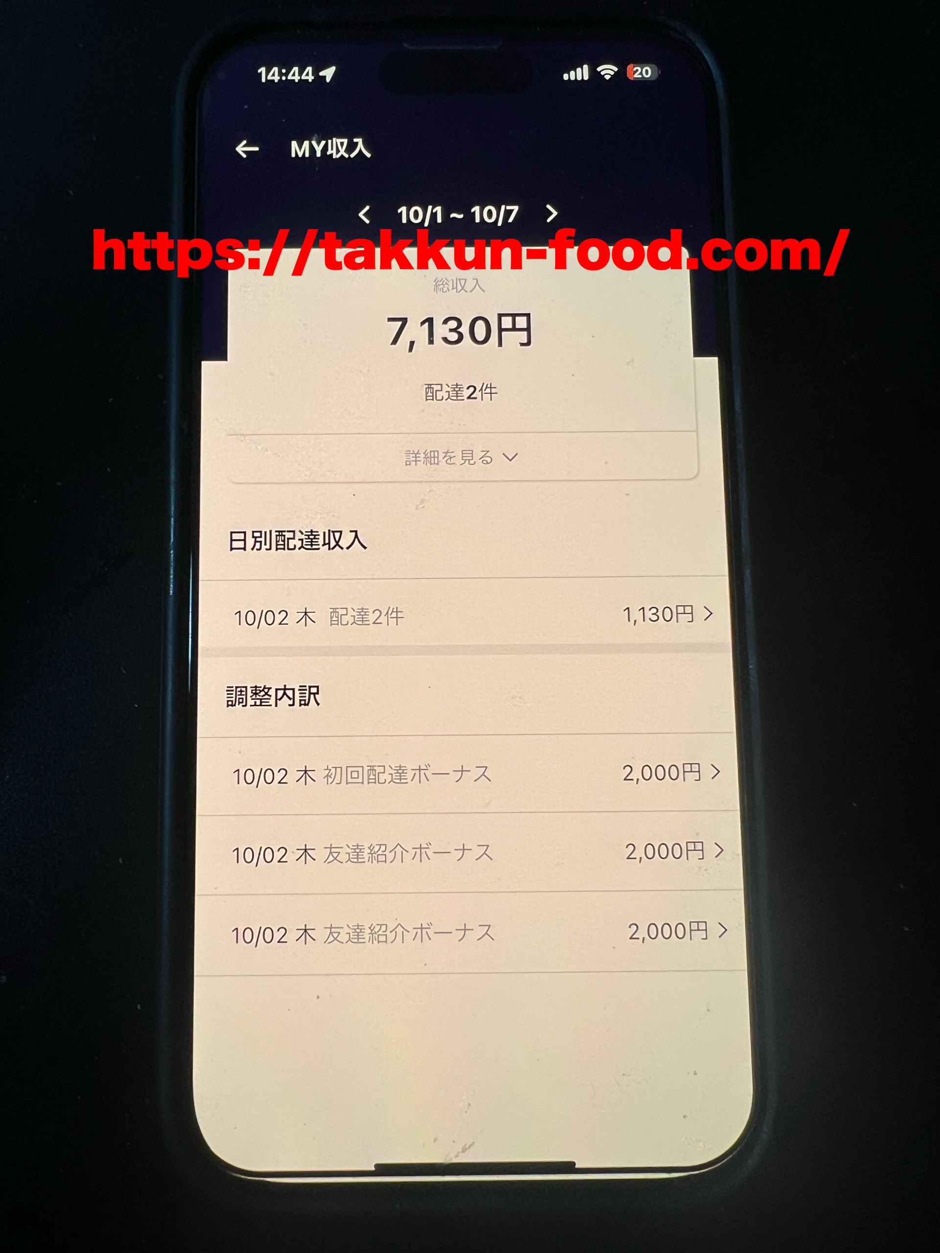 僕も実際に2件配達してこれだけ稼げました!友達紹介2人したのでボーナスで4000円がもらえました。